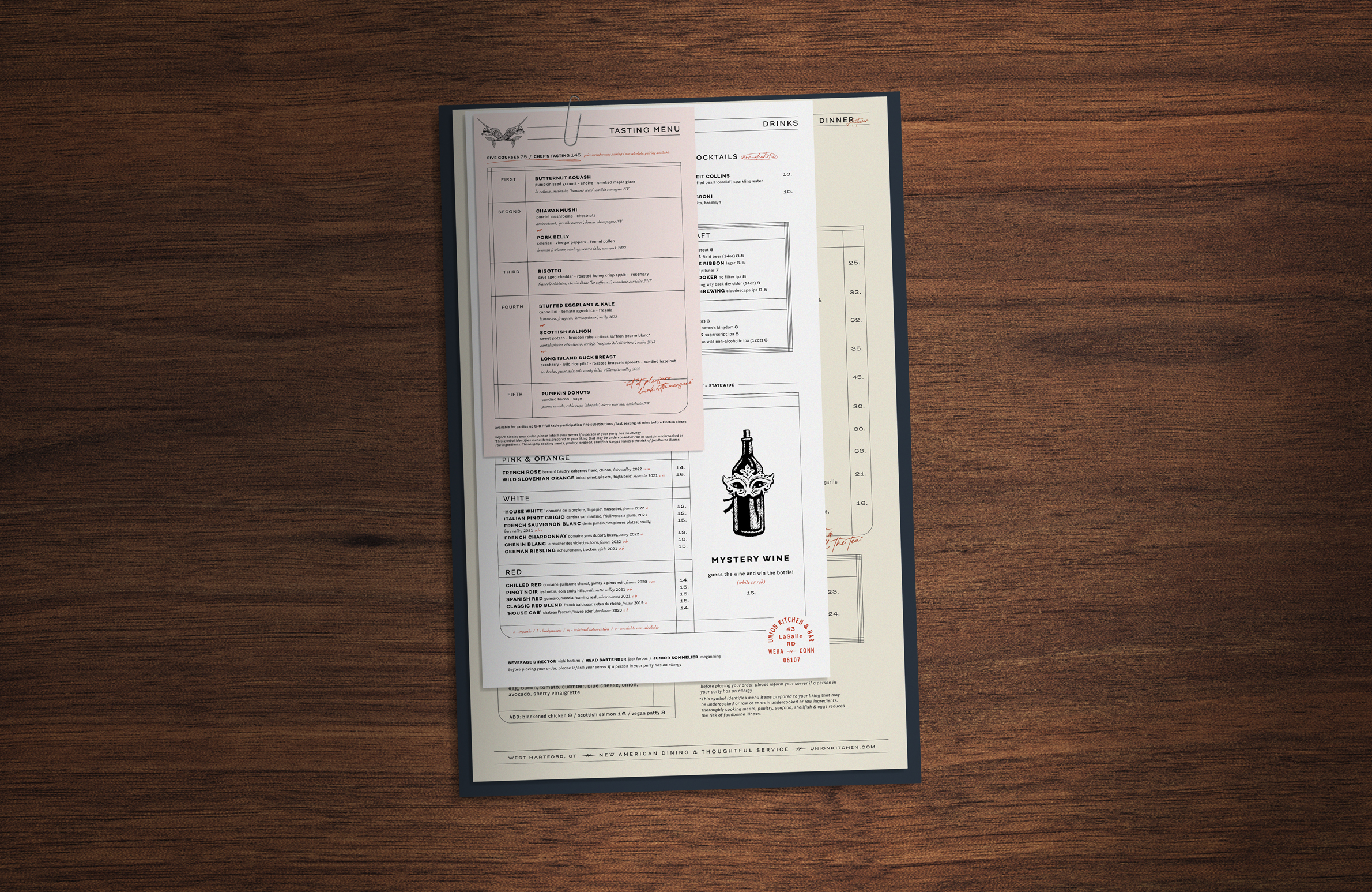 When reimagining the Union Kitchen menus, we took into account one of the main goals: the re-reinvention of fine dining; keeping it honest, human, and casual but in an eloquent way that matches the Union Kitchen experience. The menus feature design sensibilities you’d find associated with both fine dining menus and vintage American menus. Adding the illustrations adds a bit of cheeky playfulness, while the hand-written script notes add a sense of intimacy, and aid in feeling like you’re receiving a personable experience.