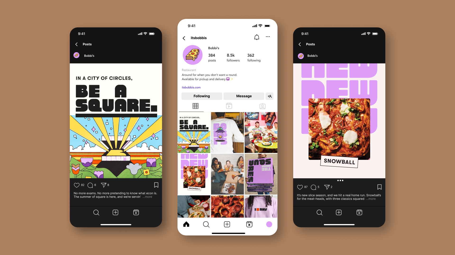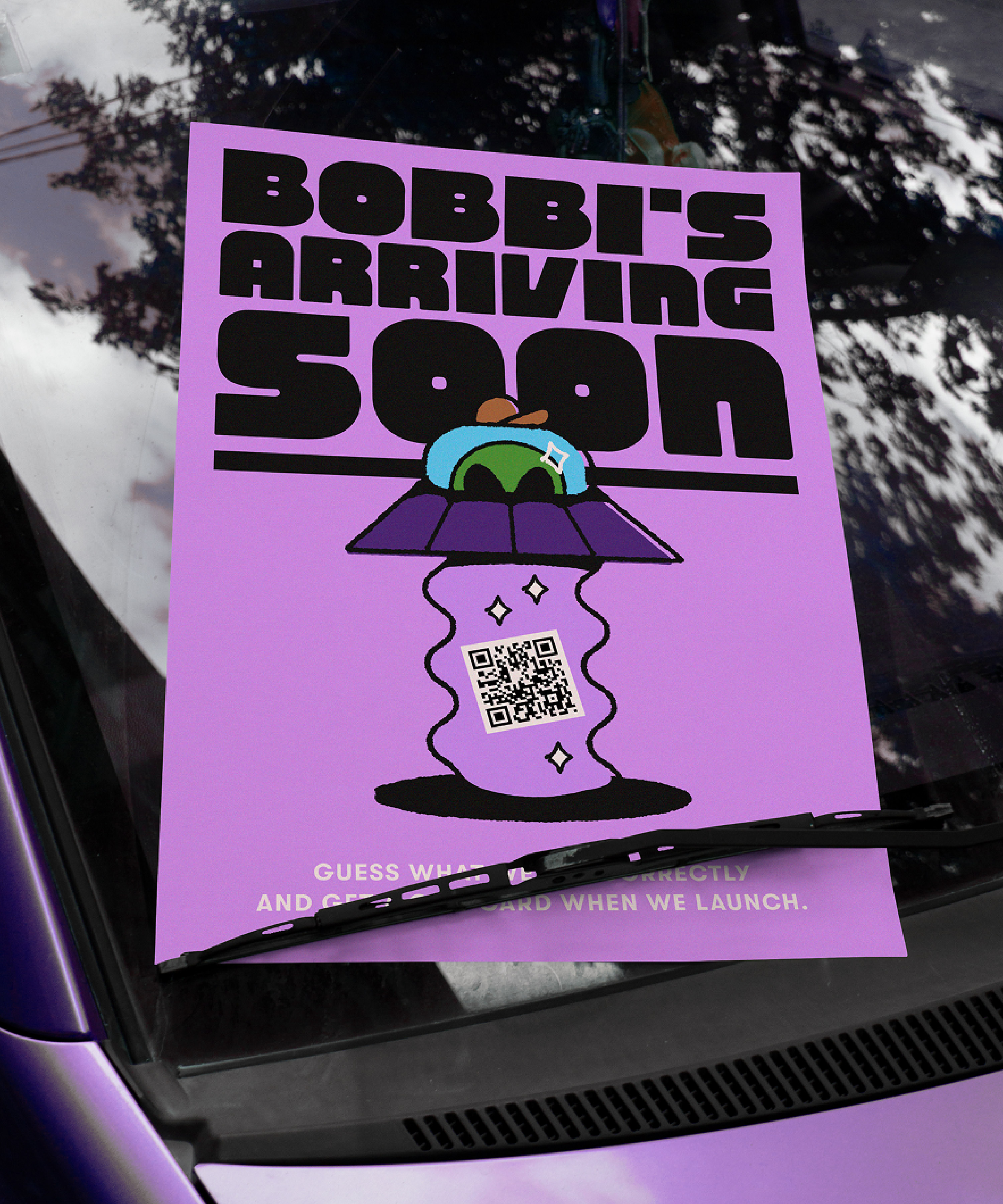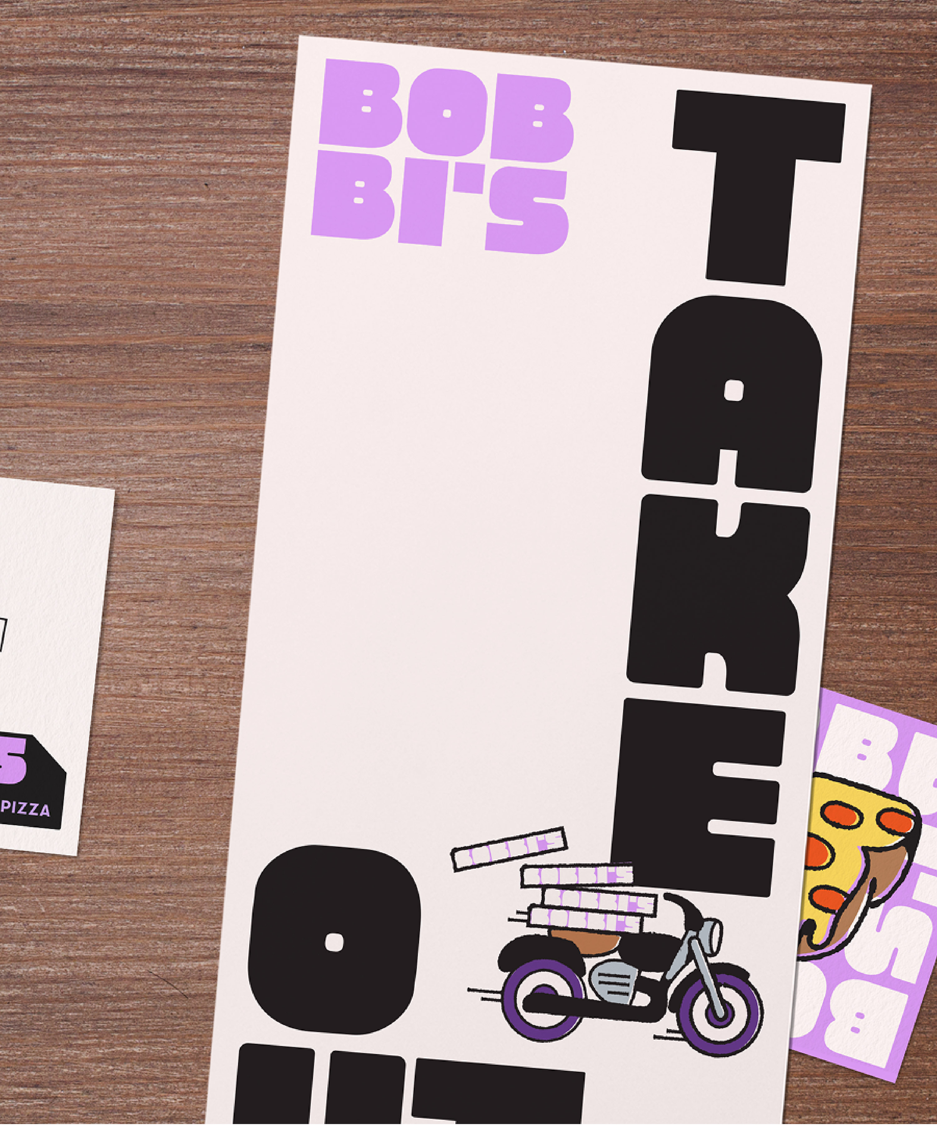 3.) Rather than traditional pizza imagery, Bobbi's is based off of the head chef's mom: a funky purple lady who was a motorcycle-riding flower child back in the day. As such, we weaved her story throughout in subtle (and not so subtle) ways, whether it be the brand illustrations and core color, or the nonchalant yet casually quirky tone of voice.