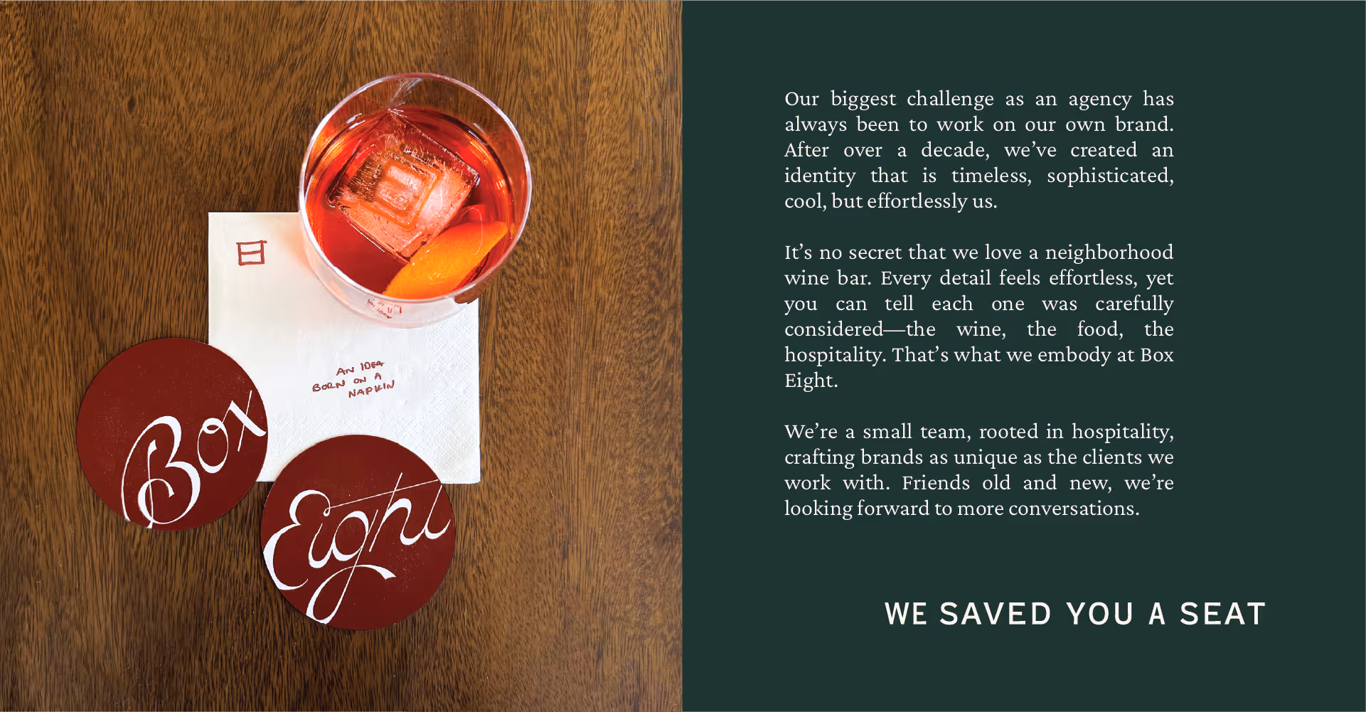 We are undoubtedly, and forever will be, friends of the hospitality industry. It was important that our rebrand embodied that, as a nod to our partners, friends, and the future of Box Eight. Subtle moments of hospitality peak through, like the vintage warmth of the color palette, the welcoming tone of the brand messaging, and the intentionally curated type layout and styling. It sparks trust, feels welcoming, and showcases our immense attention to detail. It is a reflection of who we are and the impact we aim to have through our passion of building brands and telling your story.