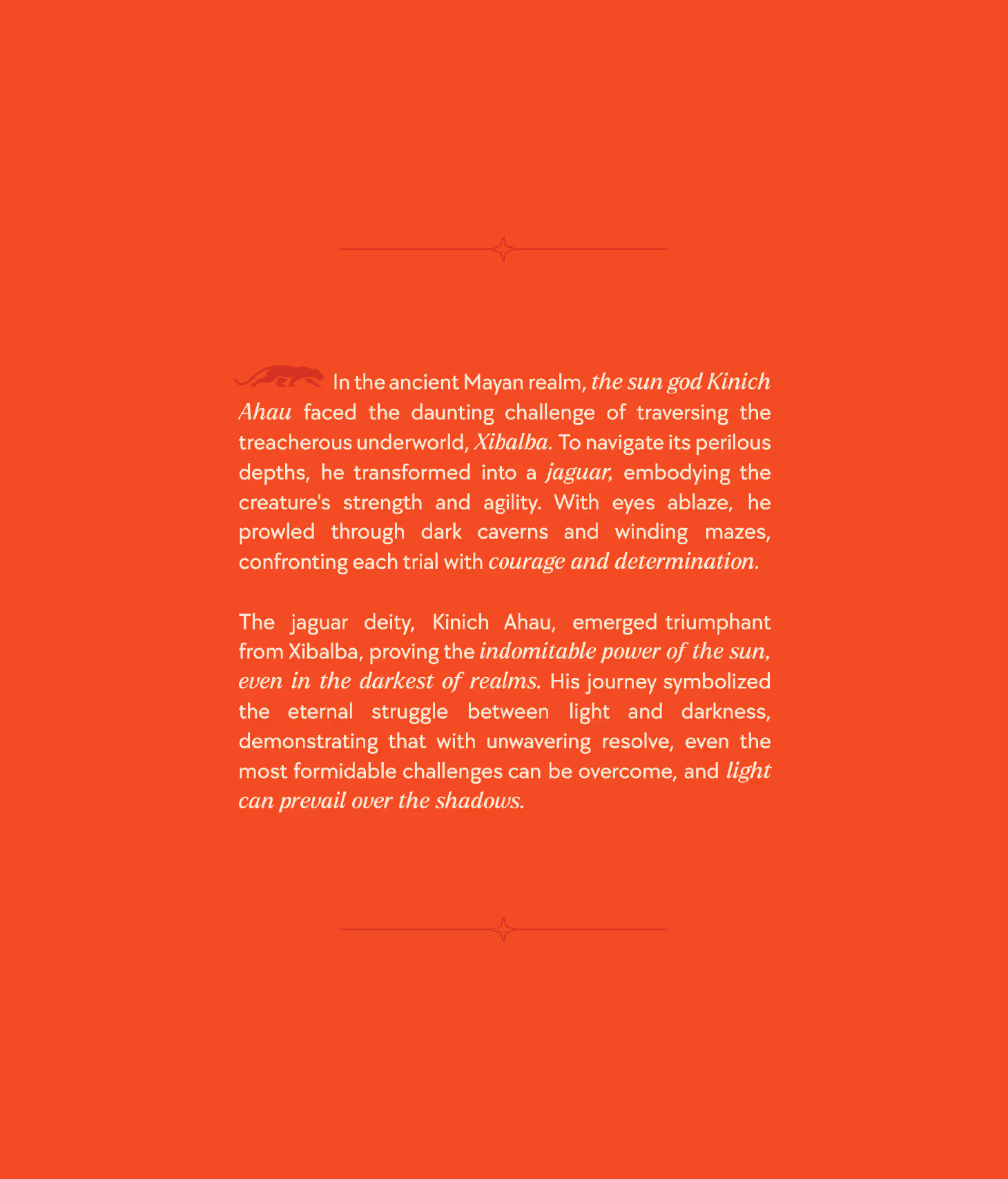 Atrevida is a concept inspired by Latin American mythology, heritage, and poetry. The name itself translates to “daring,” setting the tone for a brand that is bold, confident, and intentional in every detail. The brand narrative is rooted in the Mayan myth of the jaguar and the underworld. In this story, the sun god transforms into a jaguar to descend into the underworld, seeking safe passage through darkness.