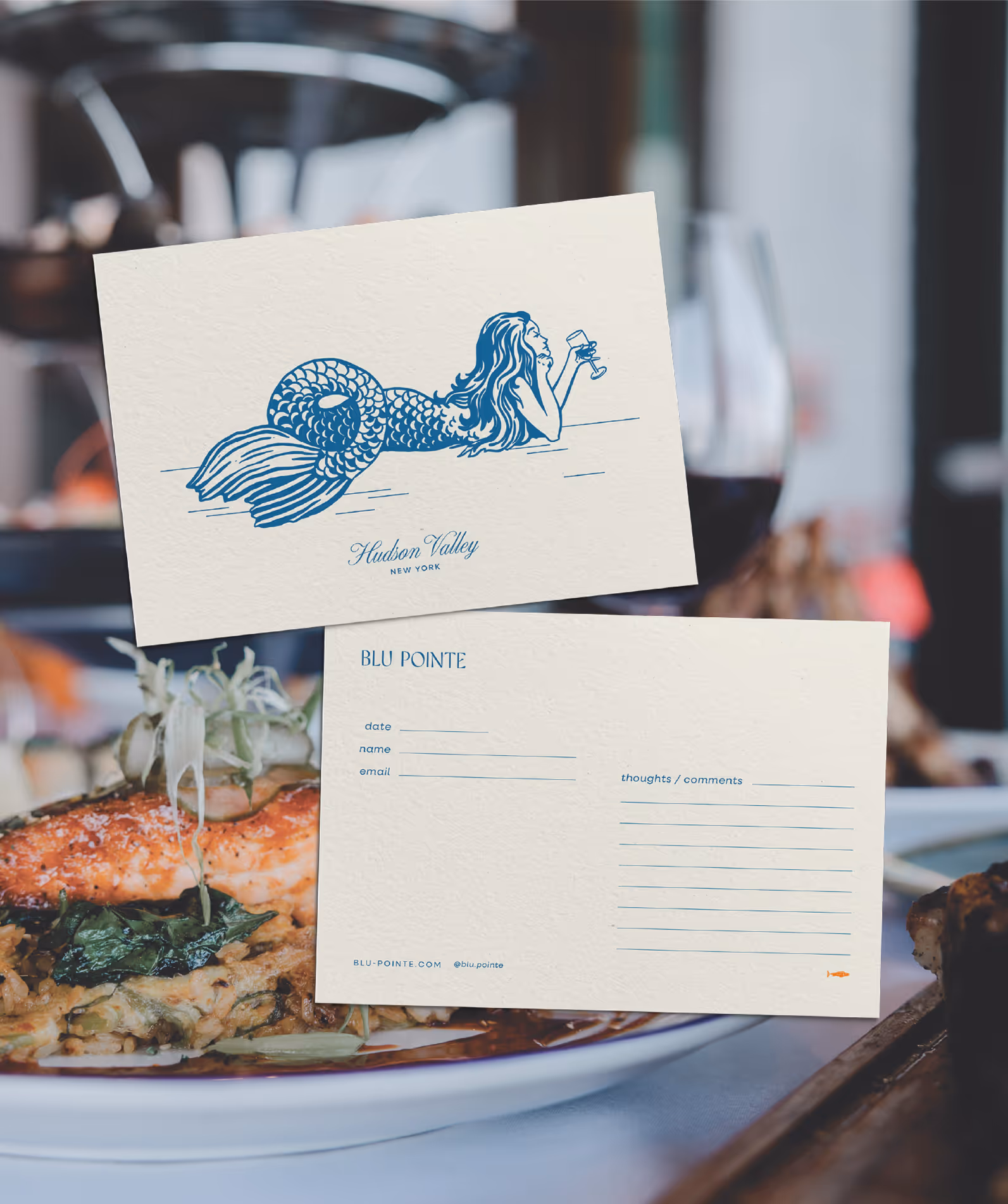 Recognizing the need to evolve alongside its discerning clientele, Blu Pointe partnered with us on a comprehensive brand refresh to complement its recent interior renovations. The custom wordmark draws inspiration from the beautiful waves of the Hudson, with organic serifs and a flowing secondary script mirroring the river. This subtle yet intentional nod to the surrounding environment grounds the restaurant’s visual identity in its location, giving a sense of place that is central to Blu Pointe’s character.