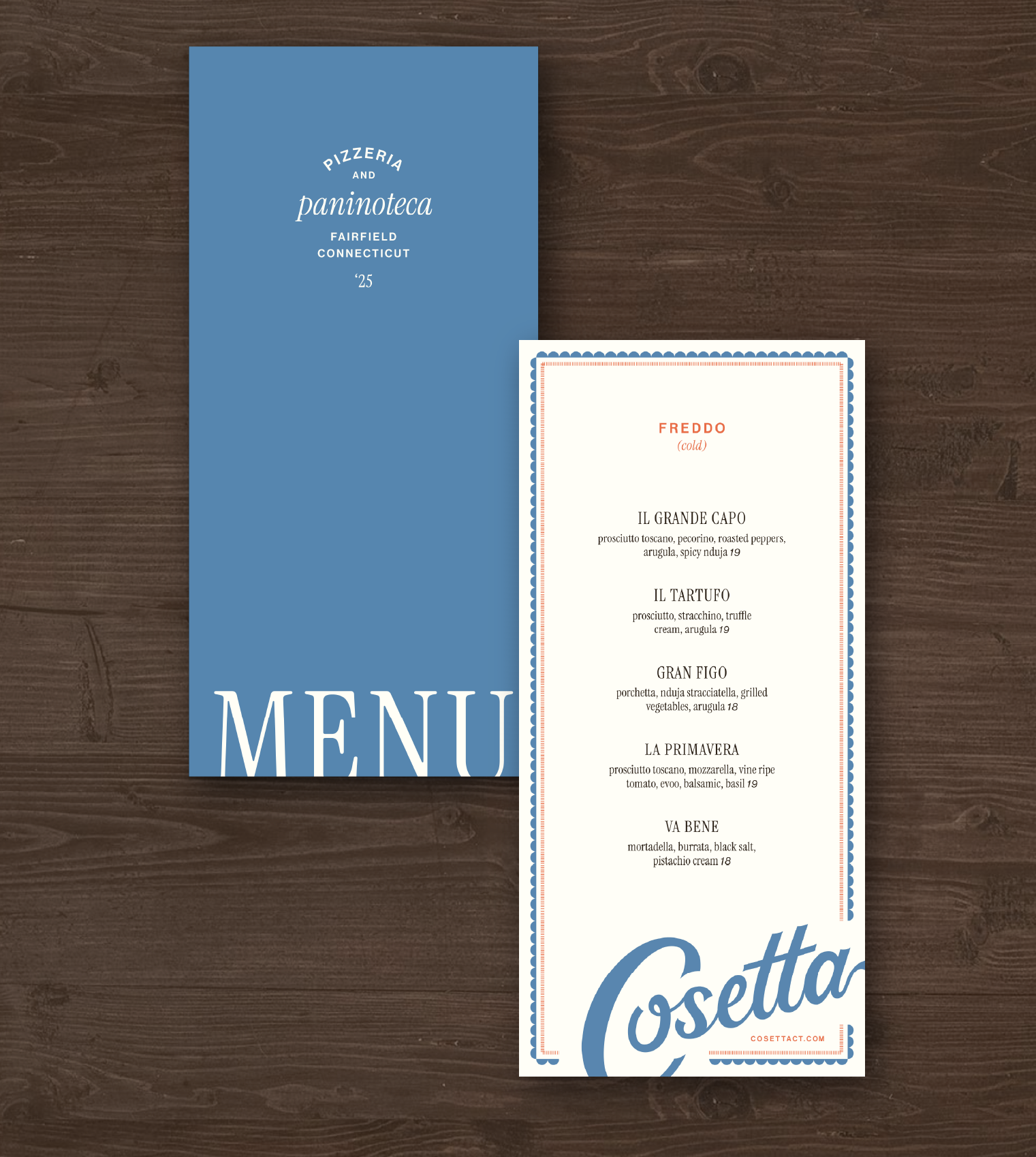The brand identity for Cosetta was designed to capture a modern expression of classic Italian food culture. It feels timeless and approachable, with a quiet confidence that reflects the care behind the menu. Rather than relying on expected visual cues, the identity avoids the typical red-and-green palette and leans into a more restrained and sophisticated look. The name Cosetta, which means “little thing” in Italian, sets the tone—suggesting detail, charm, and an appreciation for life’s small pleasures.