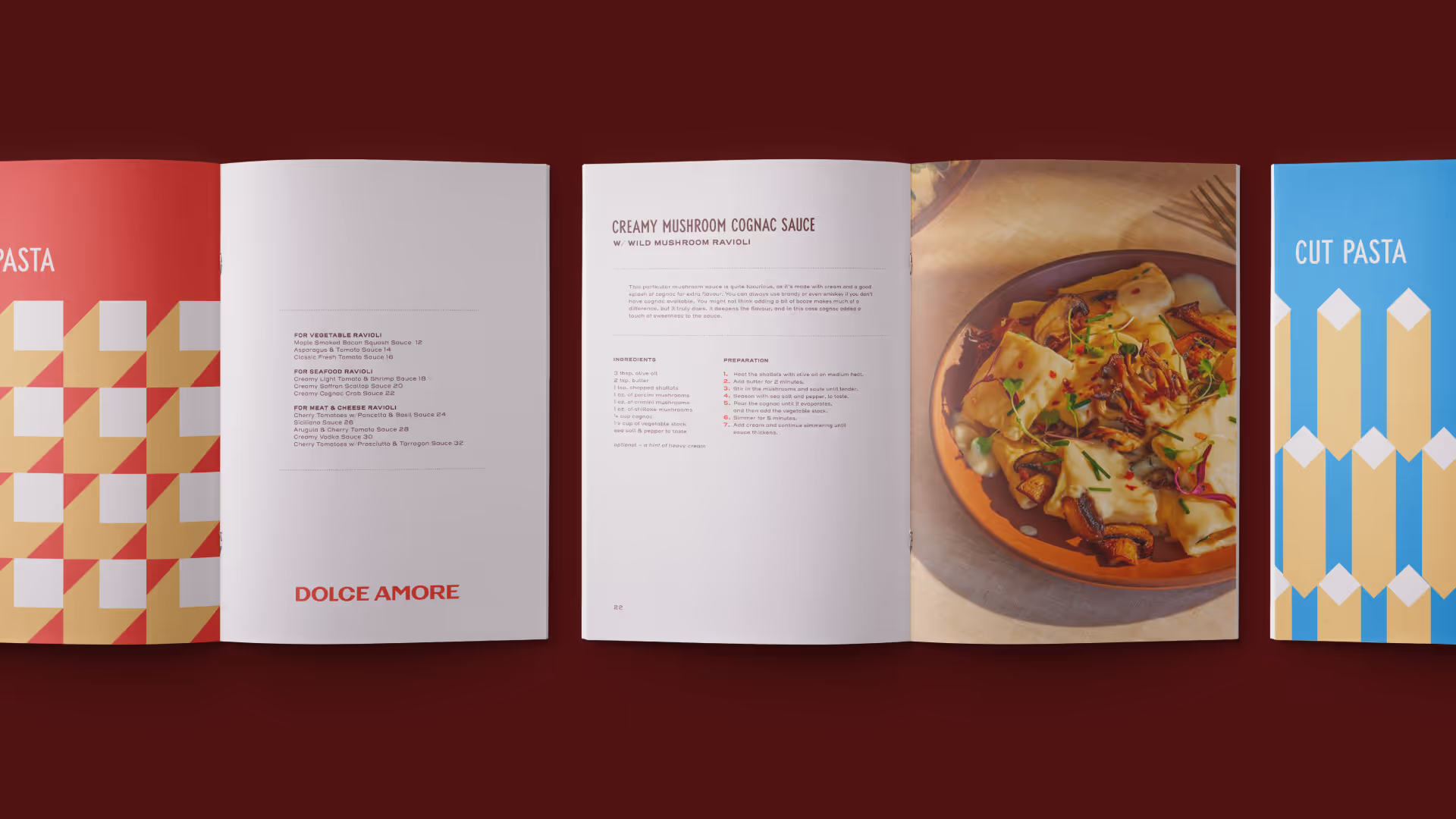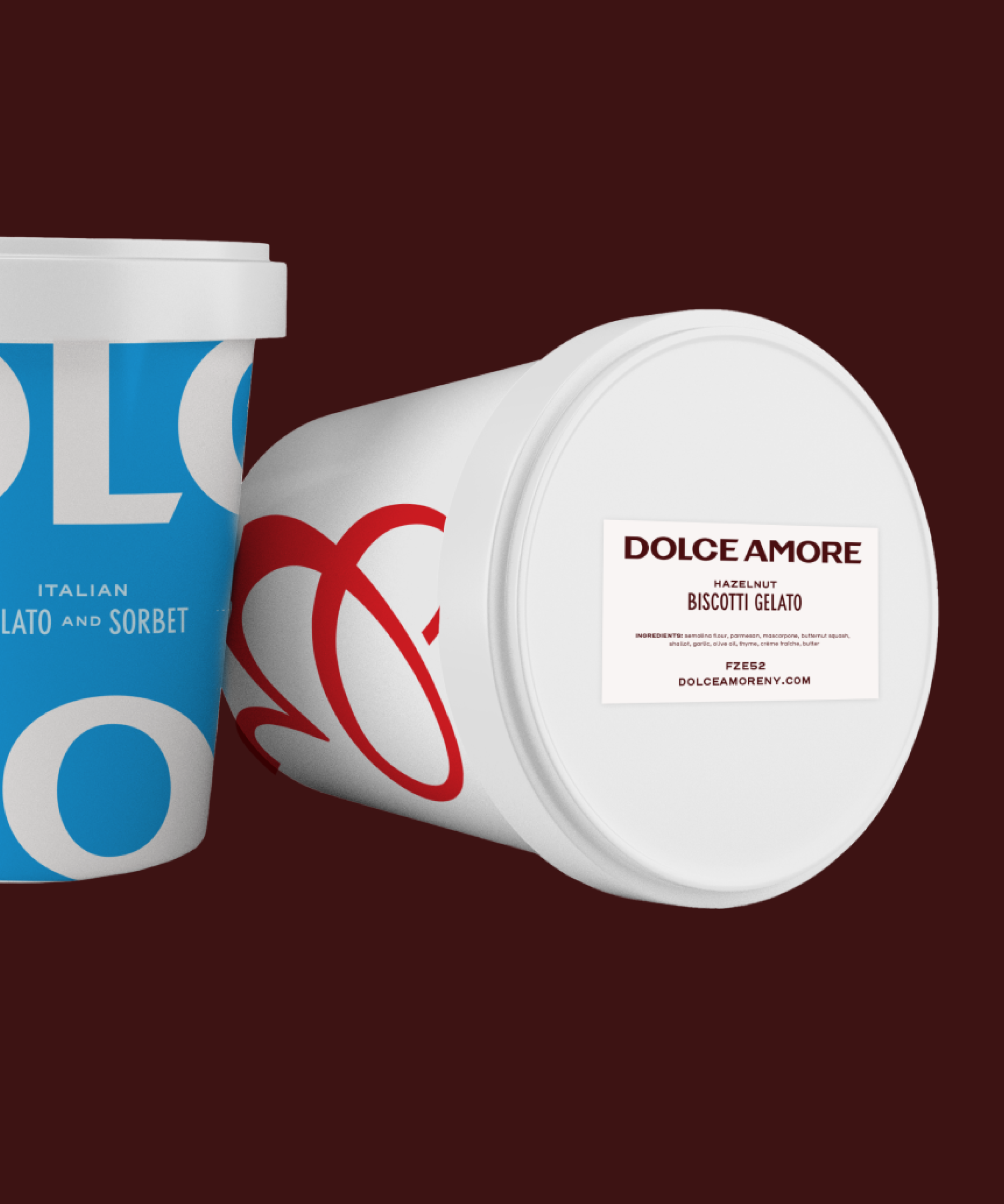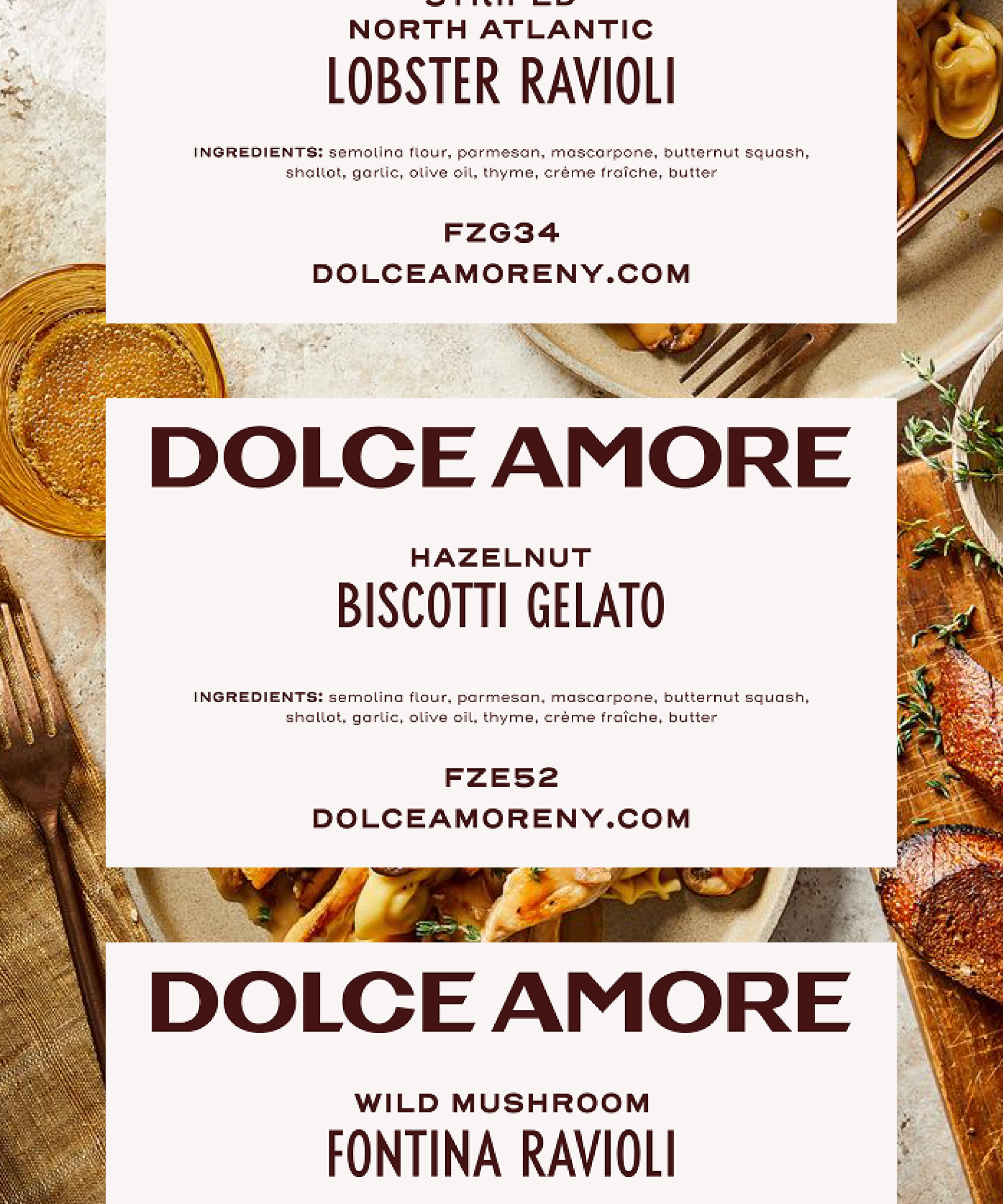 With Dolce Amore’s business featuring two core products, pasta and gelato, we developed a flexible color and pattern system to form subtle sub-brands that flow well alongside one another. As Dolce Amore’s collateral exists often on the same table, it was necessary to have colors that were distinctive, yet still could live together.