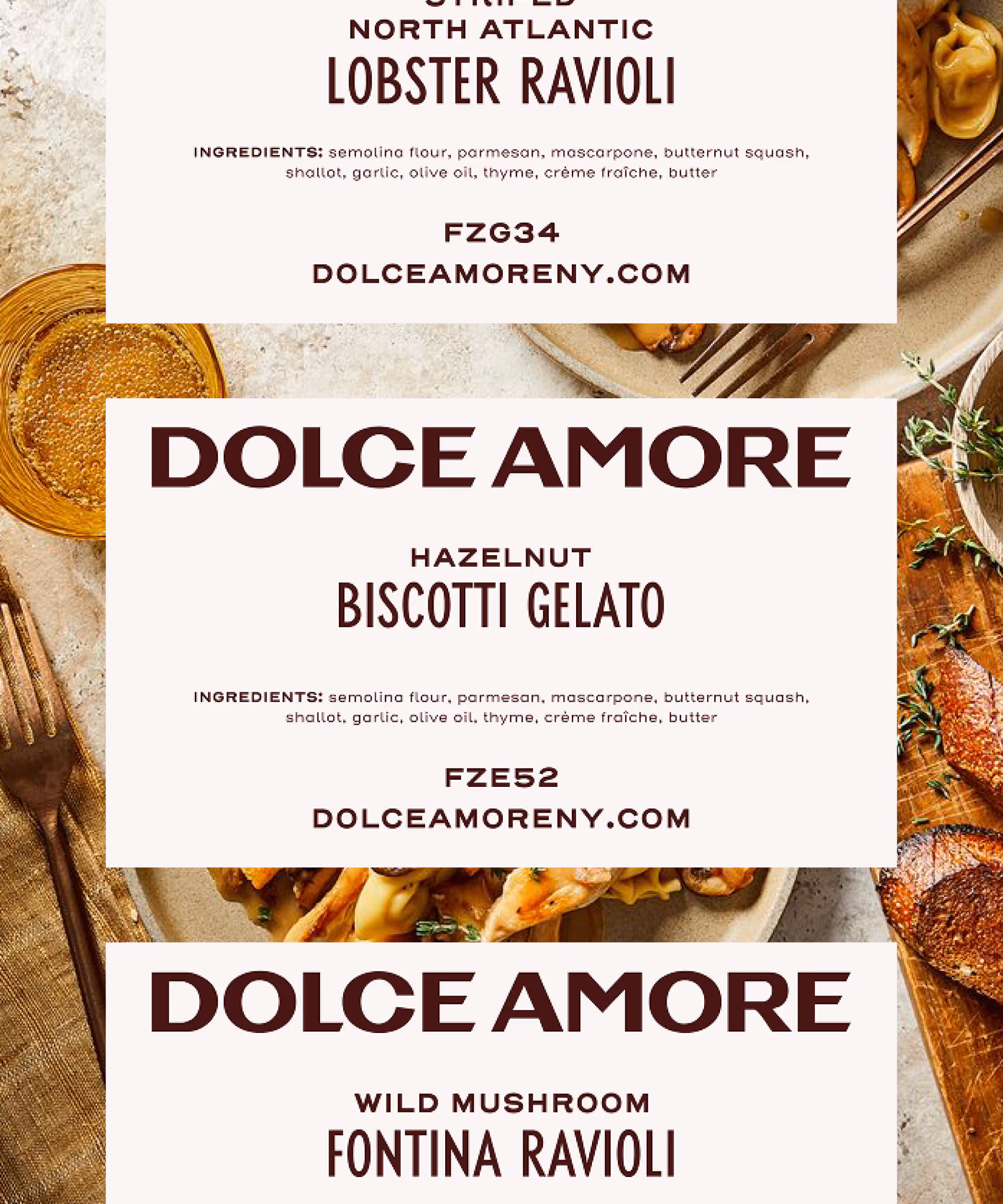 One of the core goals of the rebrand was to create an icon recognizable at any trade show, from the smallest embroidery to the side of massive shipping boxes. A modernized calligraphic “A” mark serves to represent the heart at the core of Dolce Amore, the twirl of pasta, and the family initial in one swoop. To communicate their story succinctly, we developed a simple tagline, “From Naples to New York to You.”