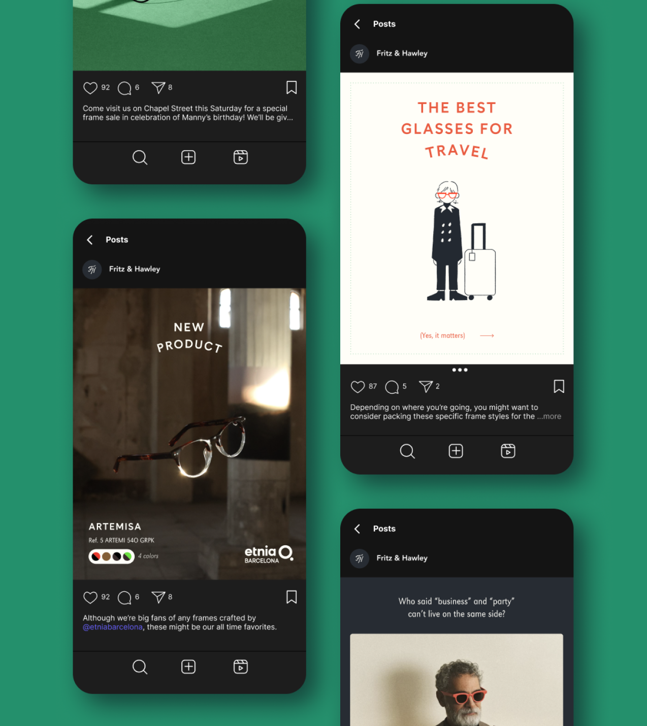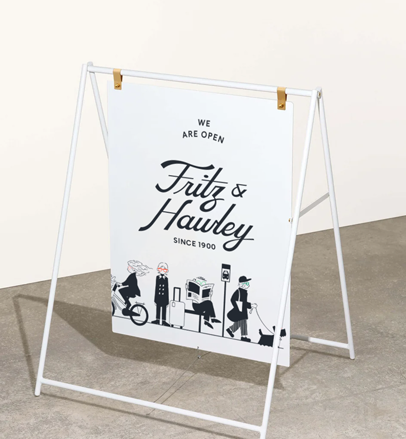 To add a new-school shop feel to the refined brand, a set of illustrations inspired by New Yorker cartoons were developed around every city’s meeting place: the bus stop. Frames on every figure function similar to Fritz & Hawley’s curated inventory, bringing every person (and dog)’s personality to the forefront.