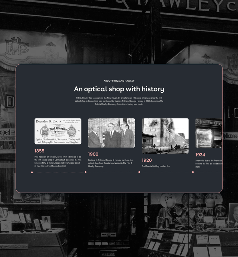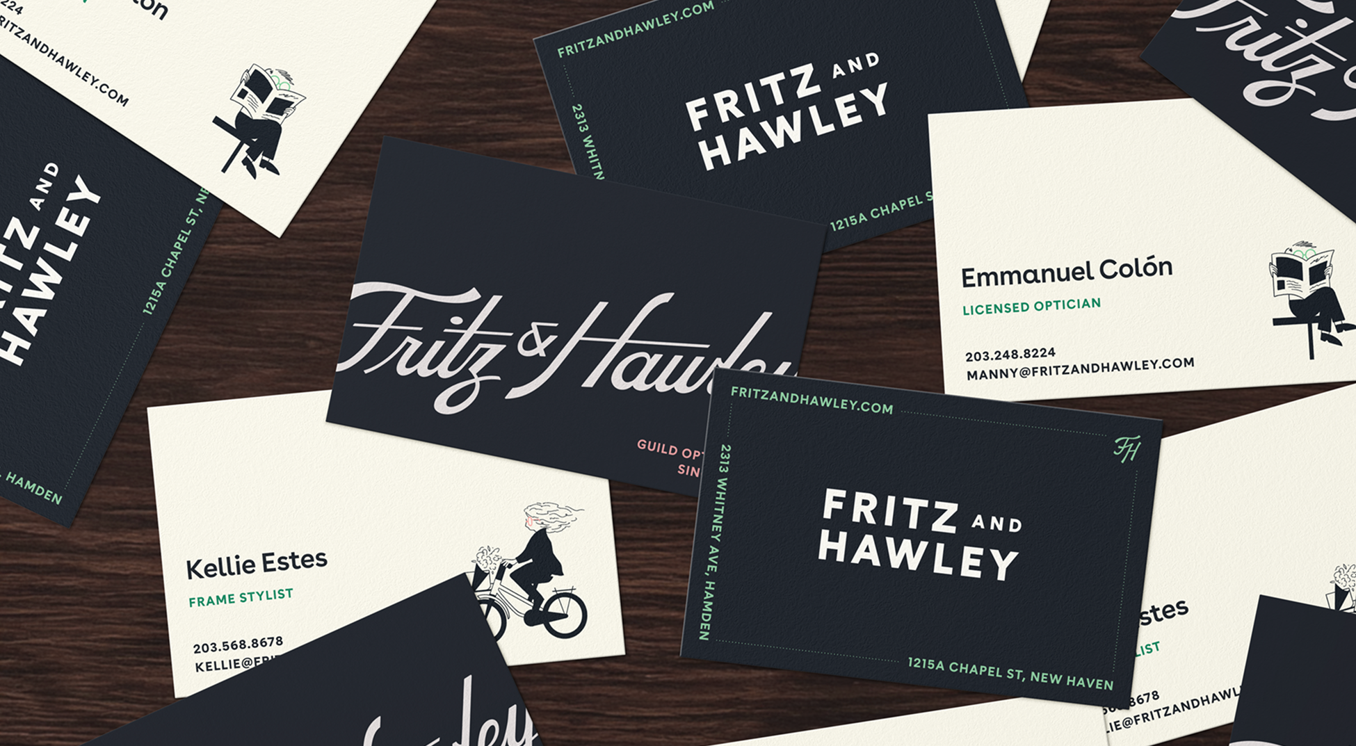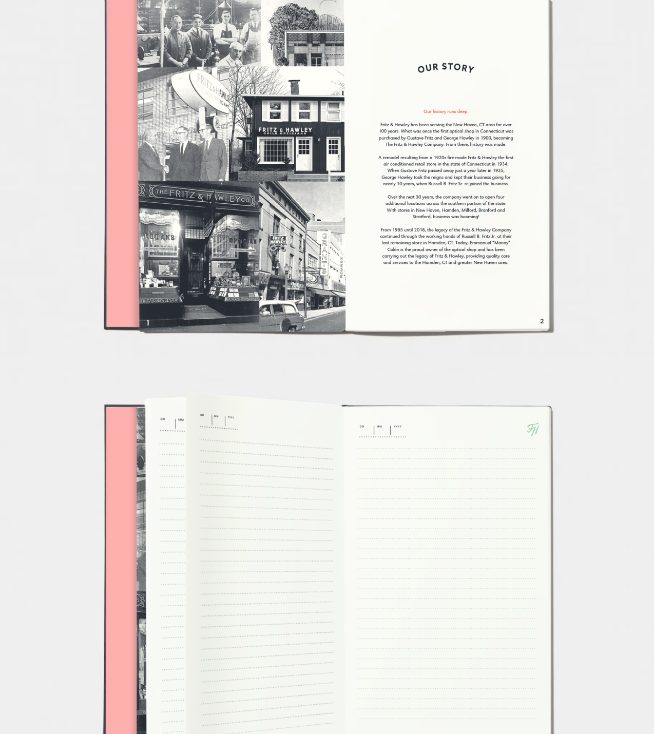 Passed down through the generations, Fritz & Hawley Guild Opticians has become a staple within the New Haven County community, and needed a cohesive visual identity wrapping their years of history together. We honored this rich past in every choice we made, whether that be including a small “and” banner in a monogram that references a Fritz & Hawley monogram from 1900, or building a historical narrative into a takeaway journal for preferred clients.